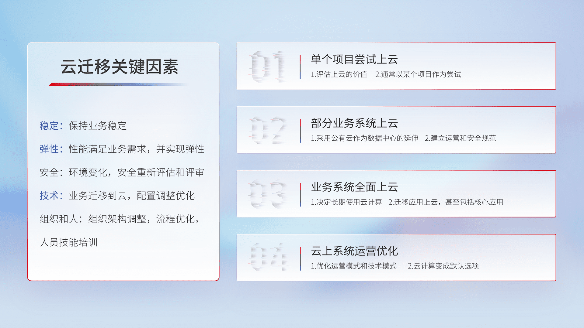 结合实际业务,,从规划设计、、、、云平台选型、、、、云原生改造、、、、数据迁移、、、集成交付,,,,迁移全过程为客户识别最佳上云路径,,,,做好风险识别管理,,,,设计网络架构、、、身份权限、、、、安全审计合规、、操作审计、、、、日志审计、、、监控告警策略、、、、多站点容灾设计等,,,,对云上基础设施进行整体规划,,,,提升IT治理水平,,,,以满足弹性、、、高可用、、、、高性能的需求。。。。