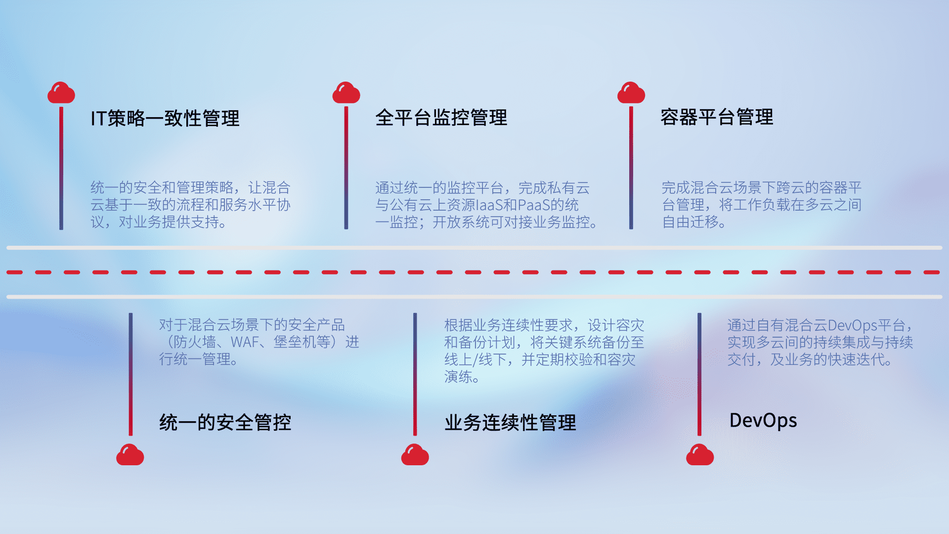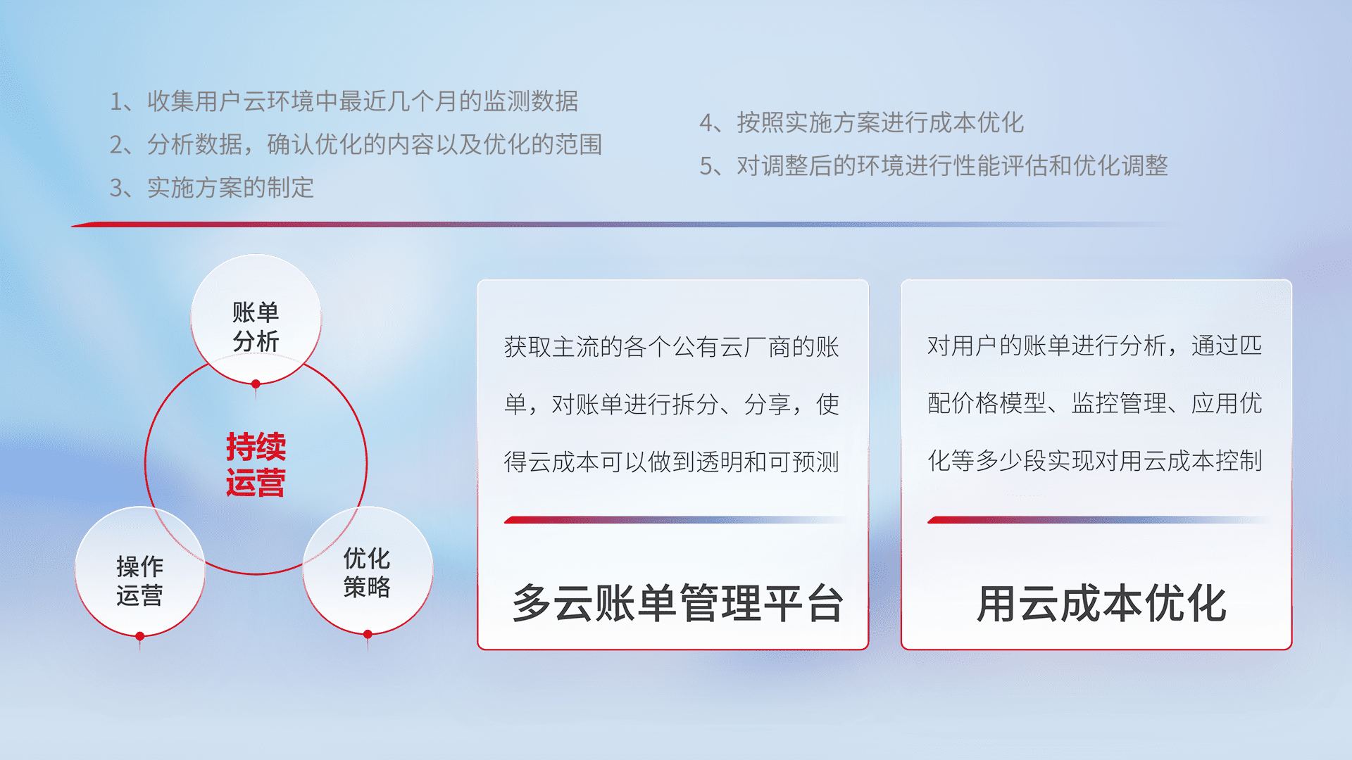 通过多云纳管,,,以统一的资源数据模型把客户的云资源进行抽象和封装,,进而实现对多云资源的统一操作,,,保障云资源管理的可靠性、、、、稳定性与可用性。。。。量身定制化运维内容,,配置、、、、开发运维、、补丁管理、、、备份、、、监控、、、认证和访问管理、、、审计和日常巡检等,,,保障在用云过程中的可靠度,,稳定度以及高可用率。。。。